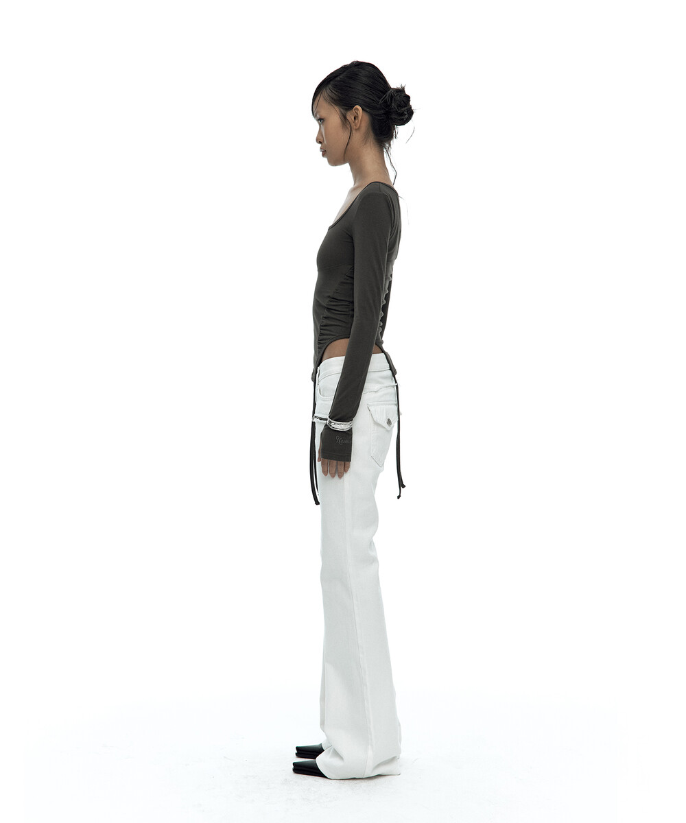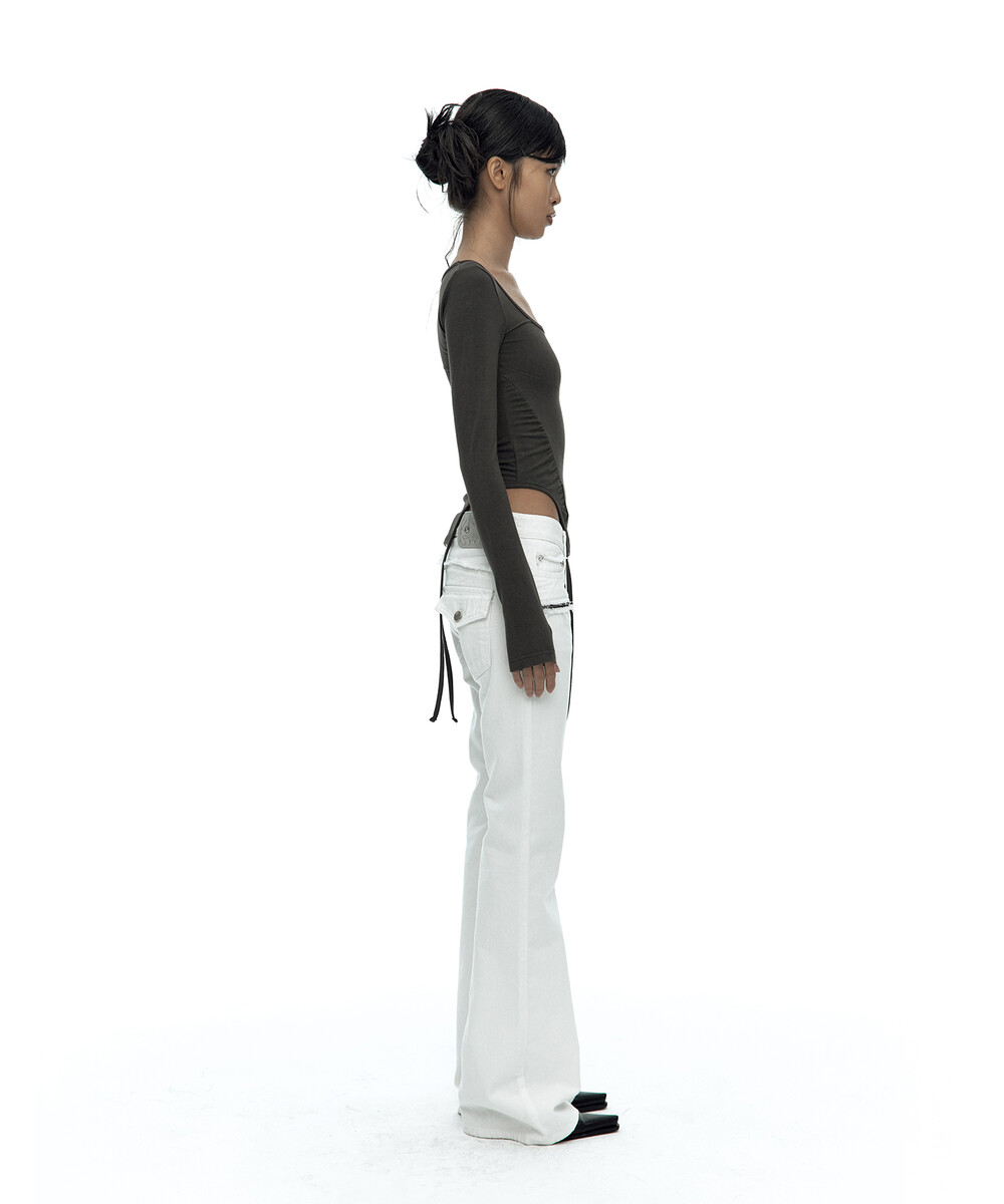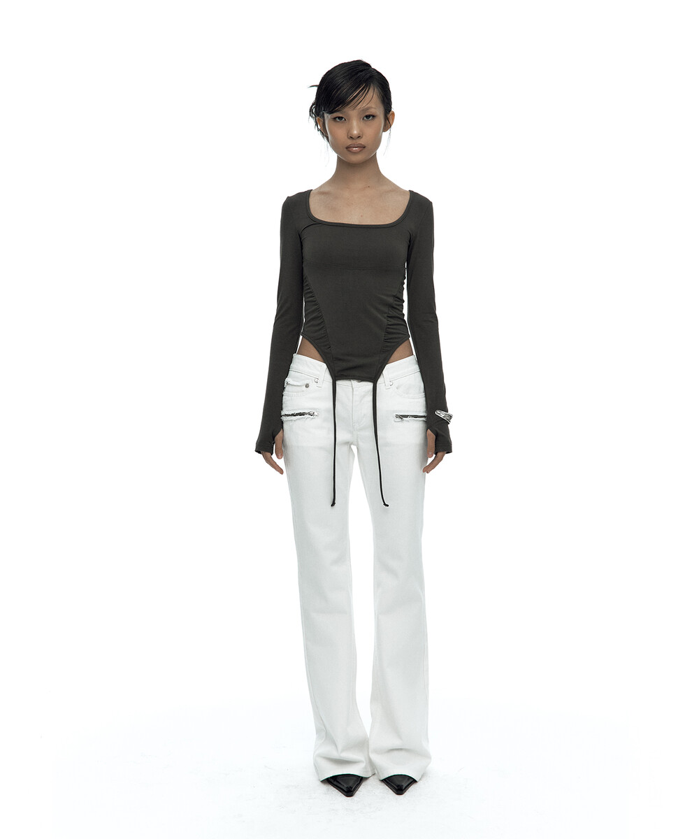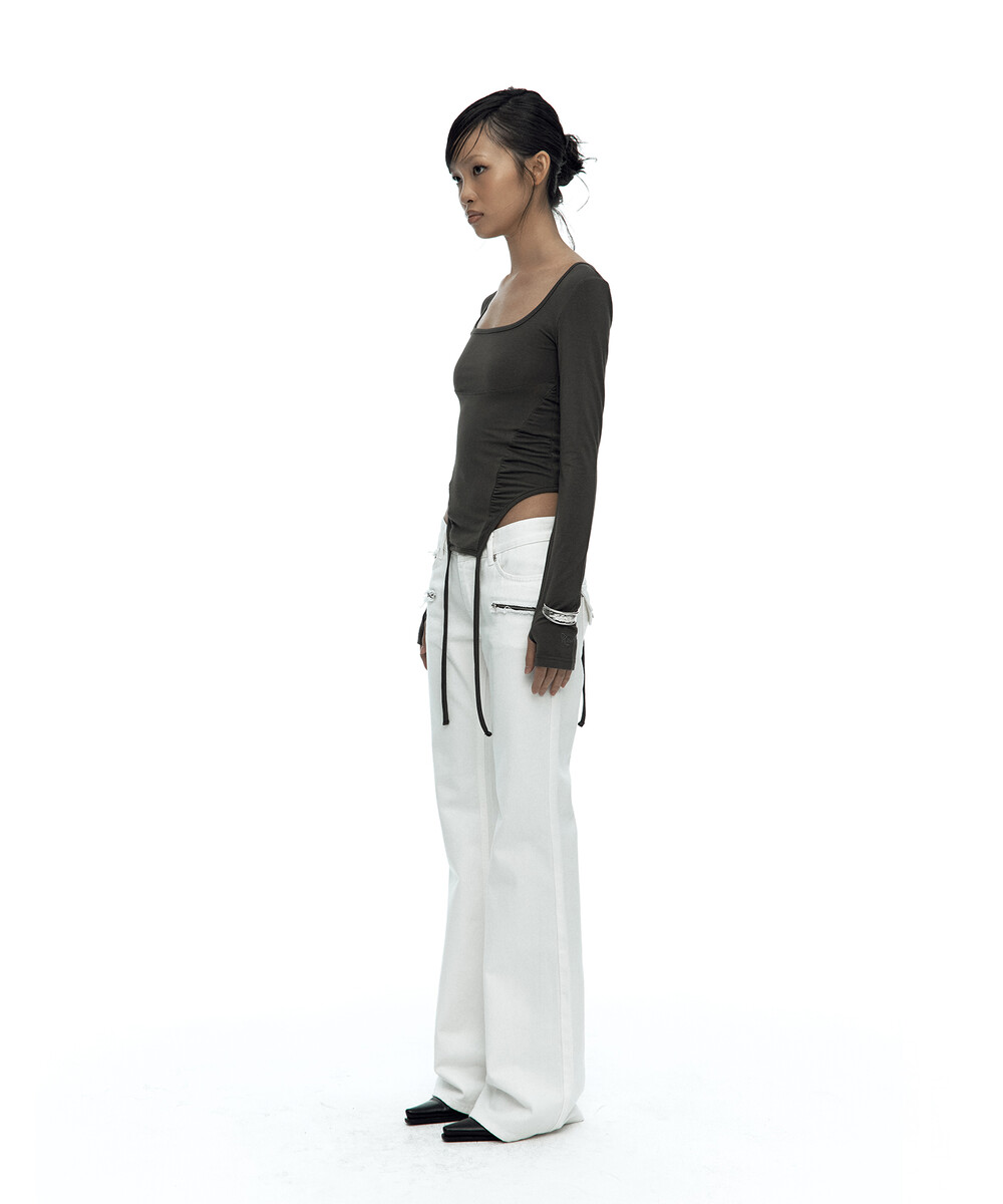 - 허리 셔링과 짧은 옆선 기장으로 슬림한 바디라인 연출