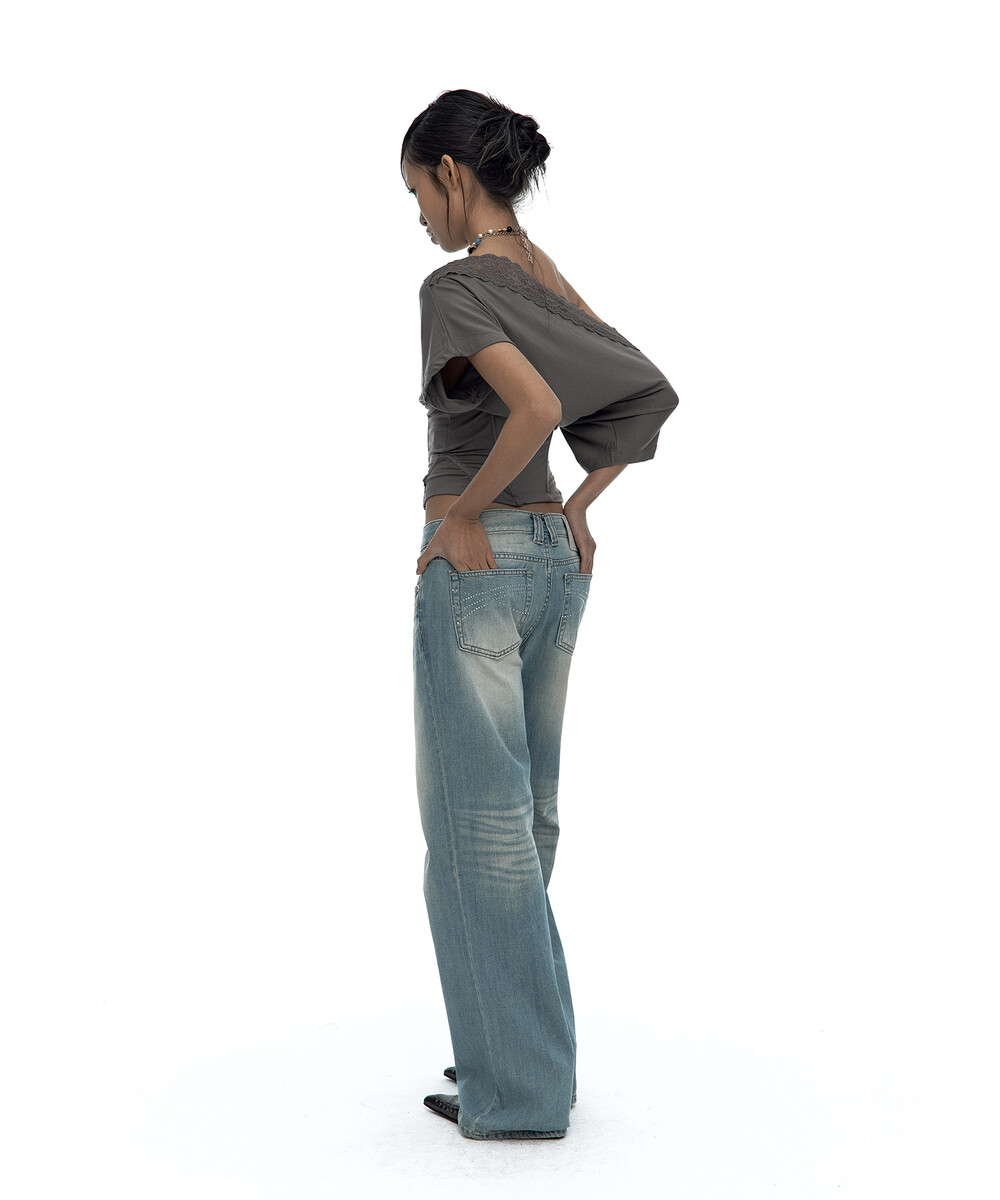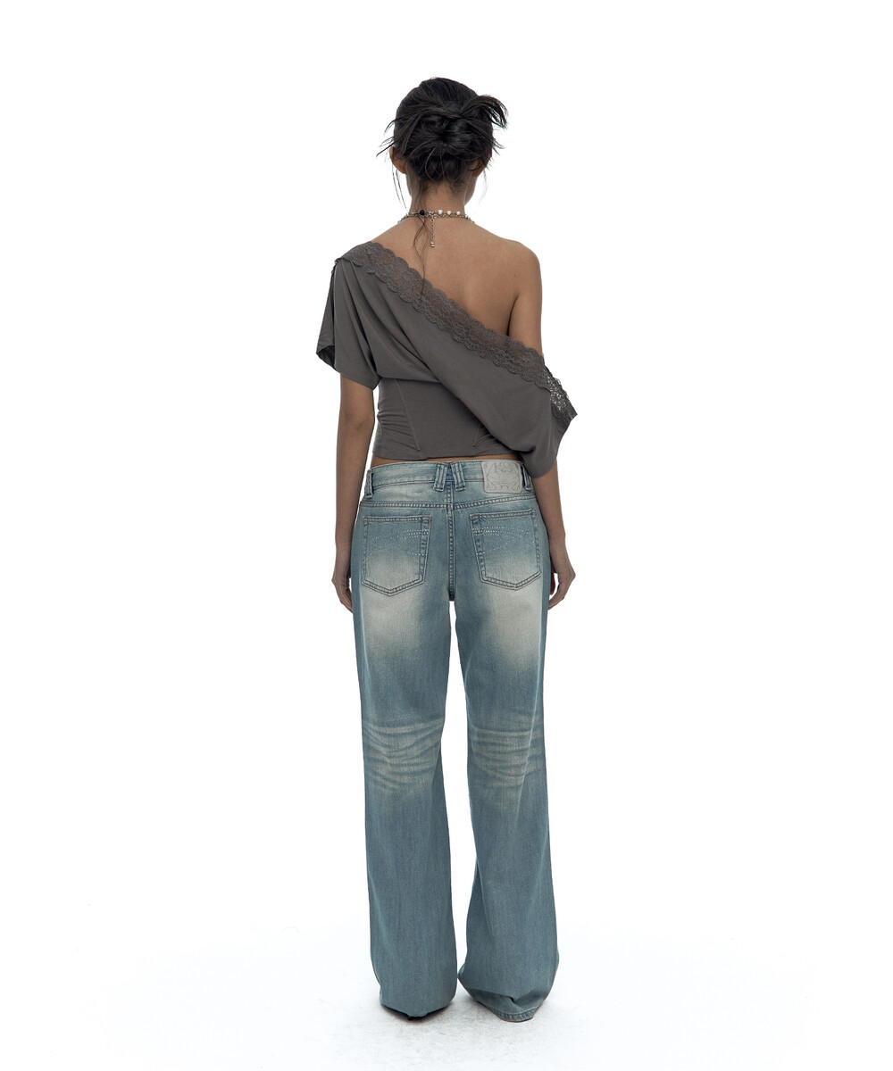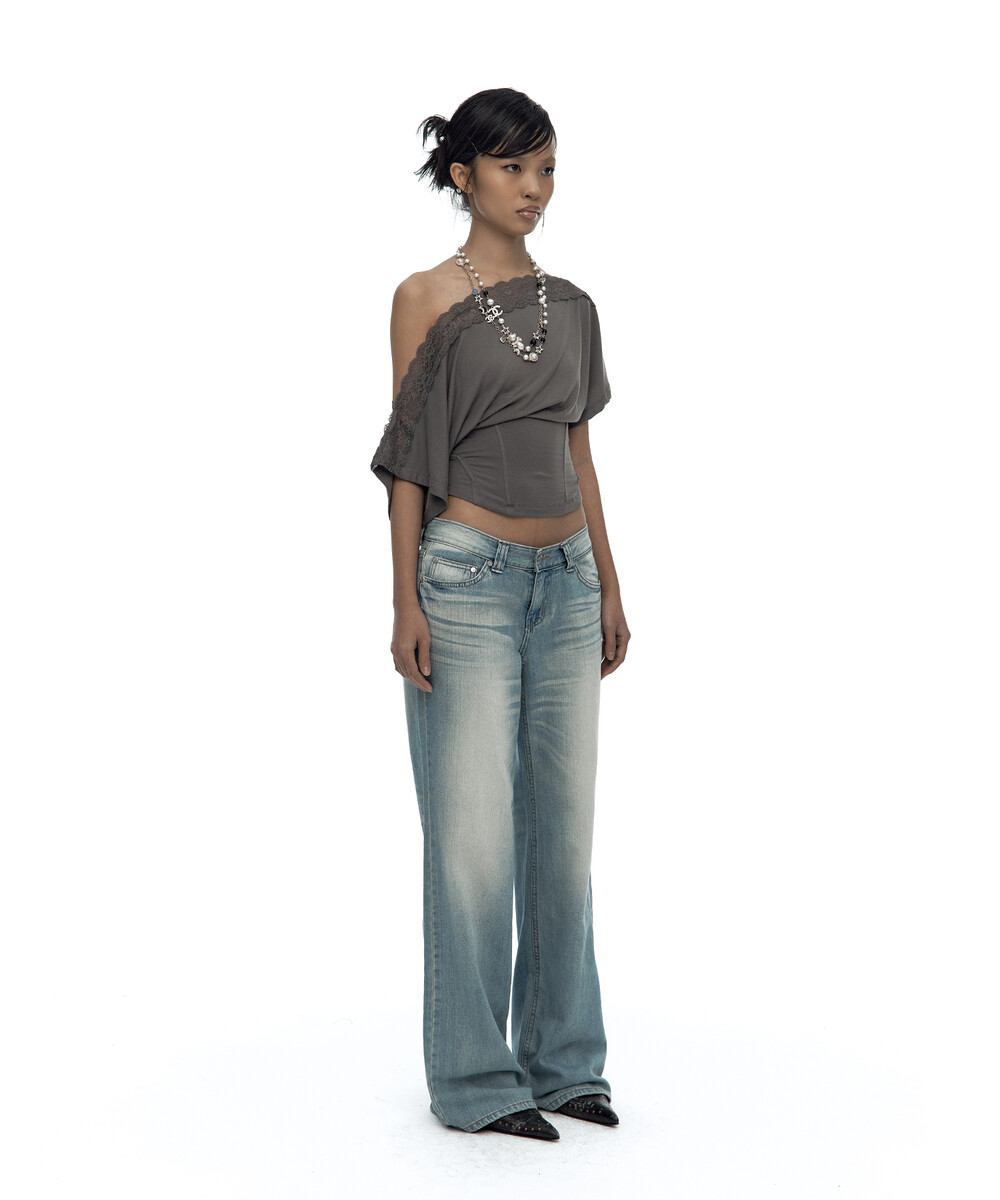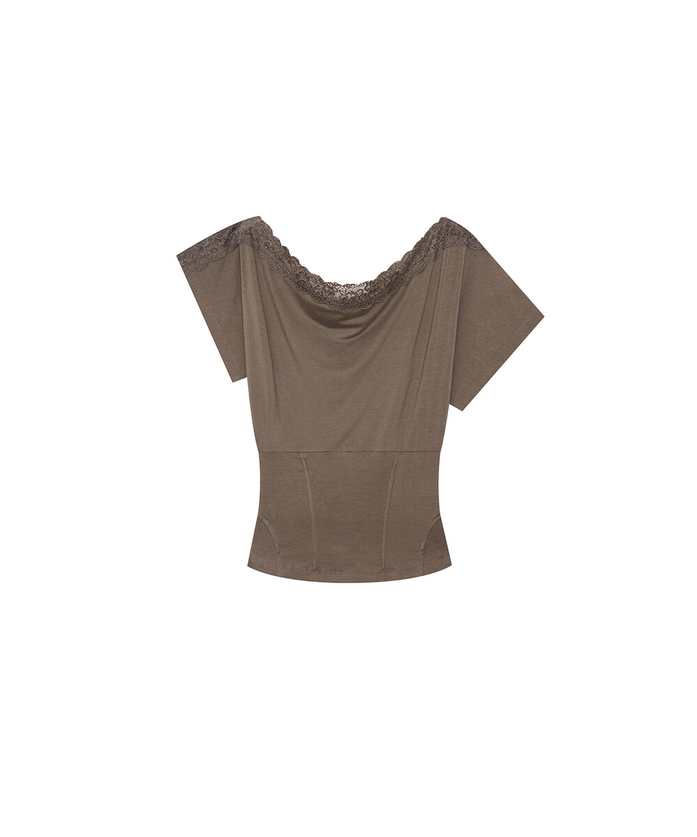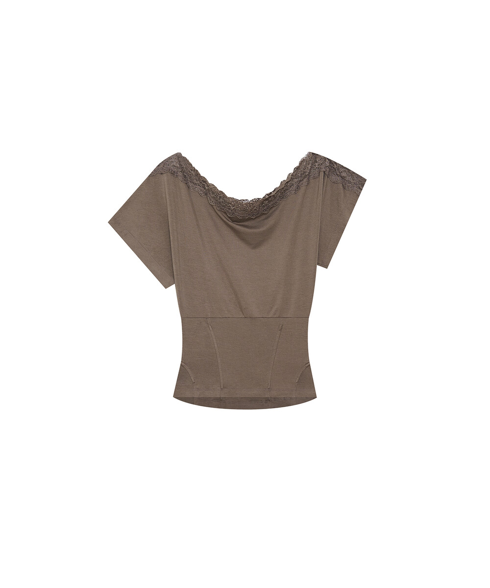 - 레이스를 덧댄 원숄더 반팔 티셔츠