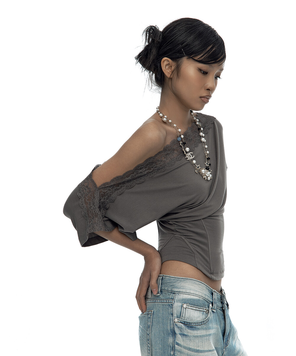 Lace One Shoulder Corset Tee Charcoal