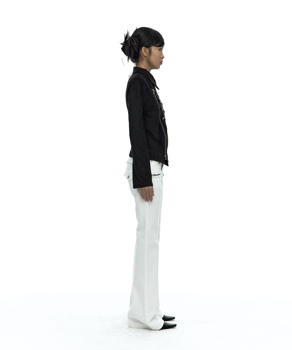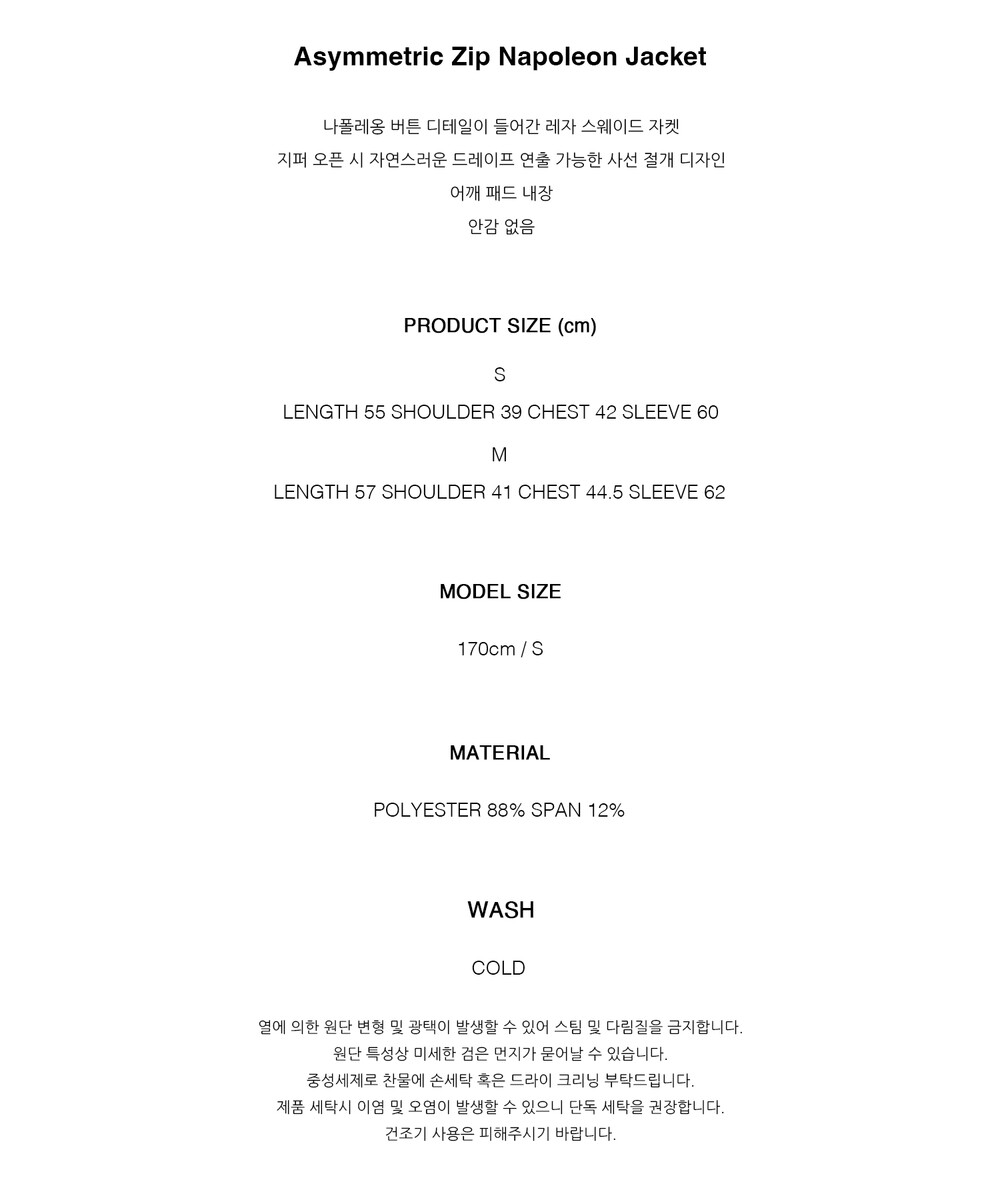 - 지퍼 오픈 시 자연스러운 드레이프 연출 가능한 사선 절개 디자인