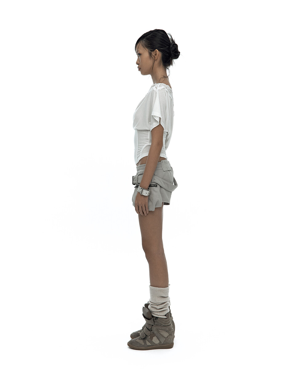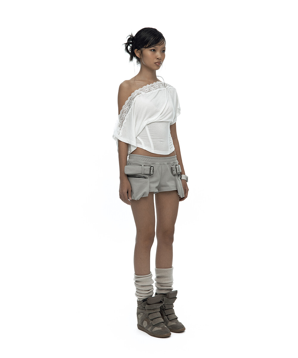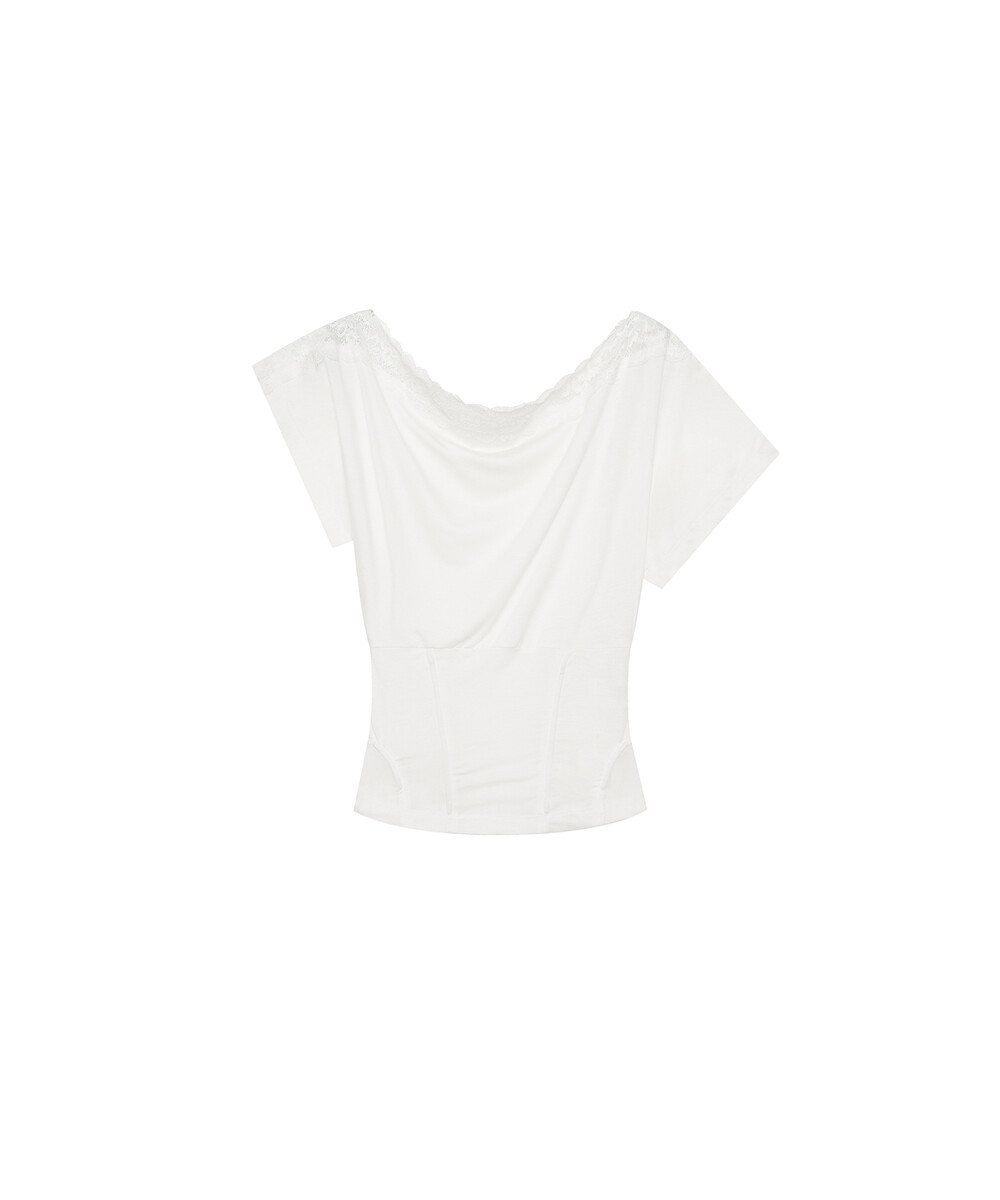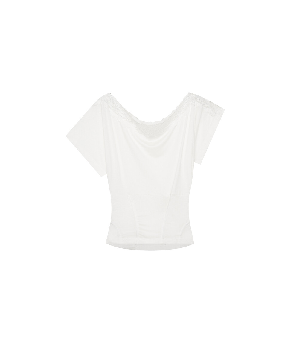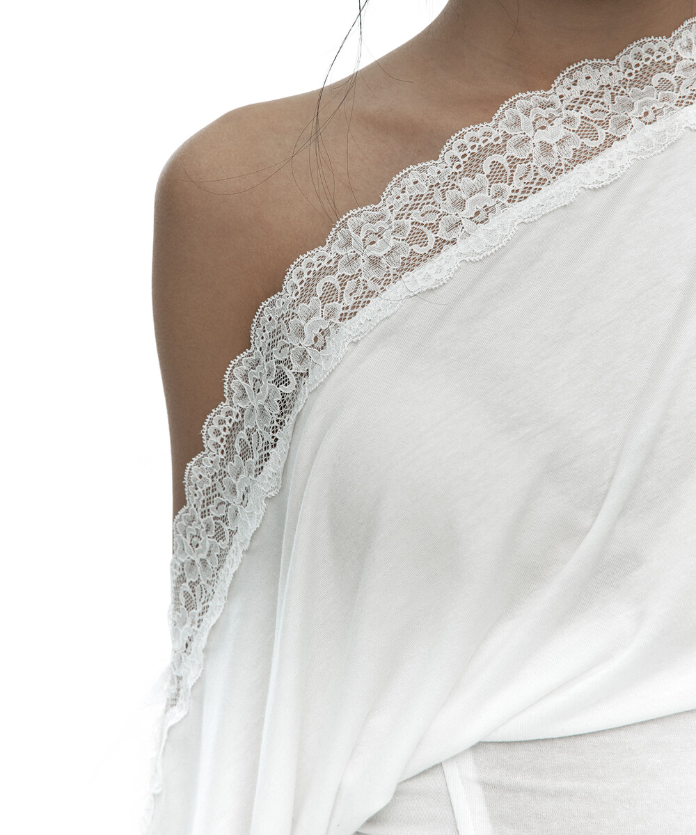 - 레이스를 덧댄 원숄더 반팔 티셔츠