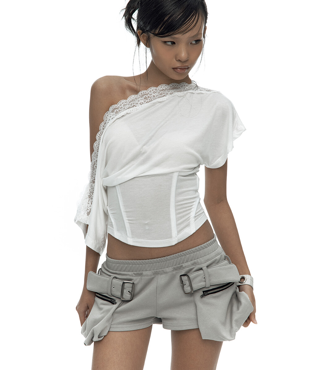 Lace One Shoulder Corset Tee White