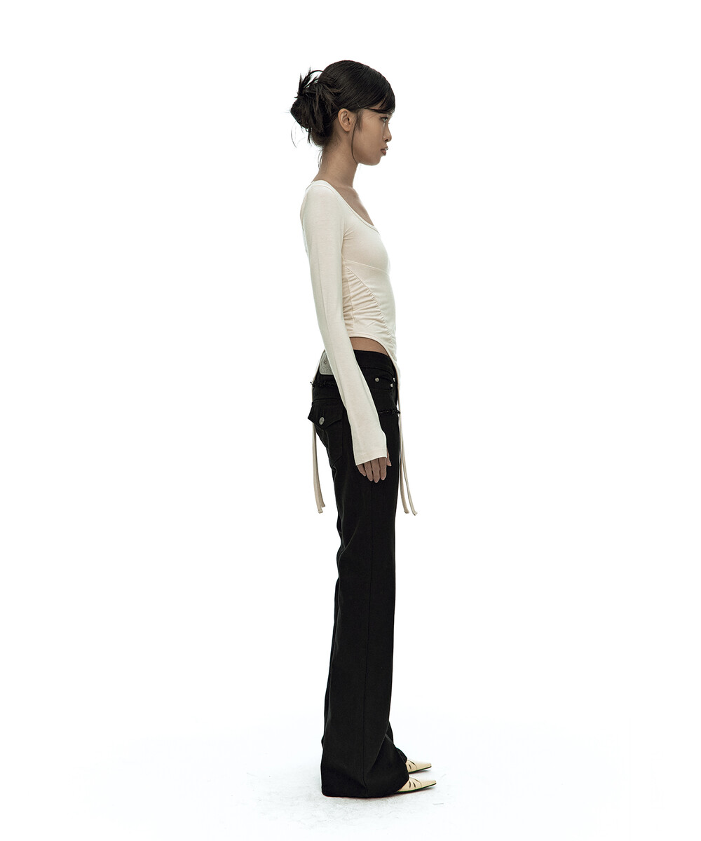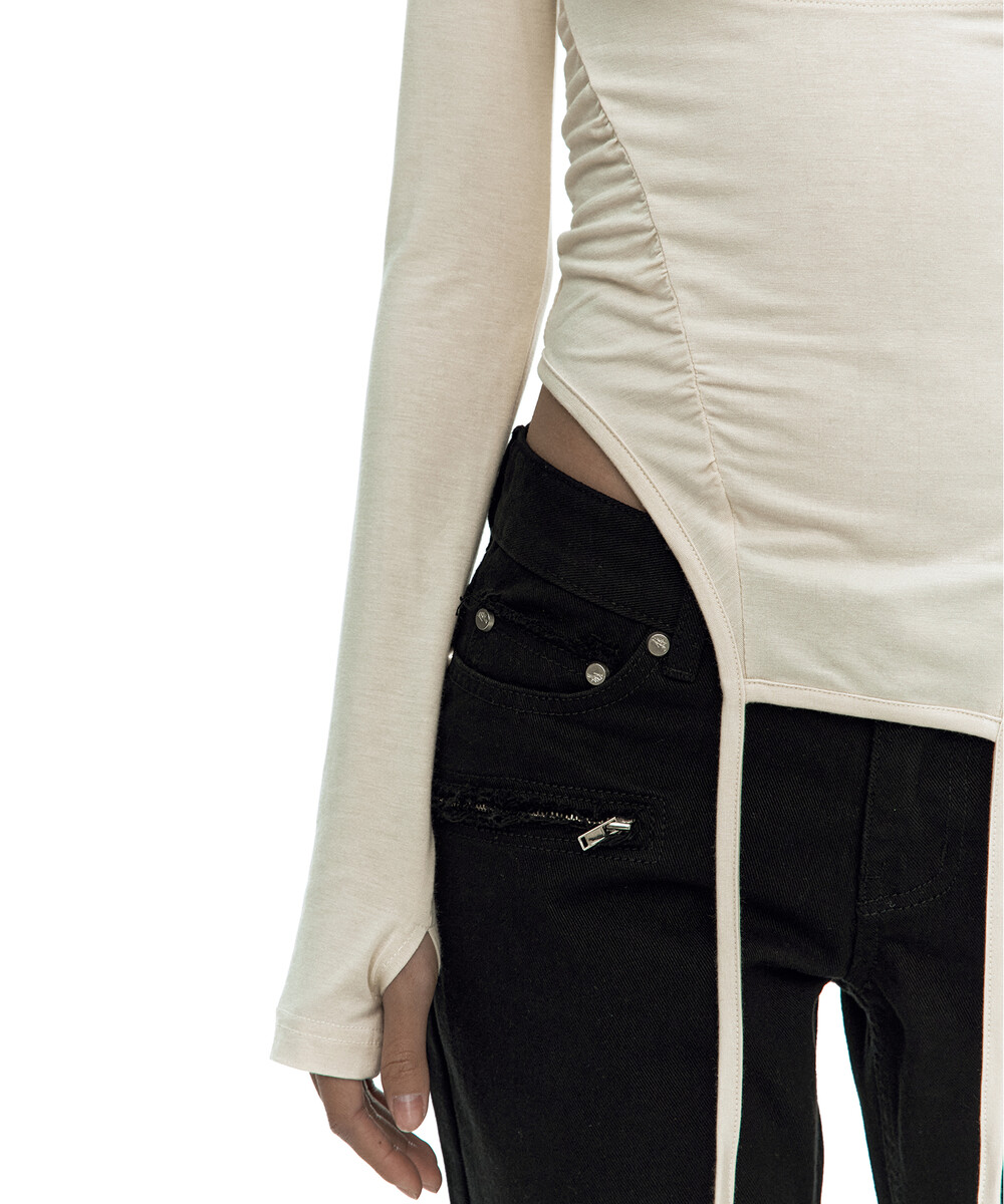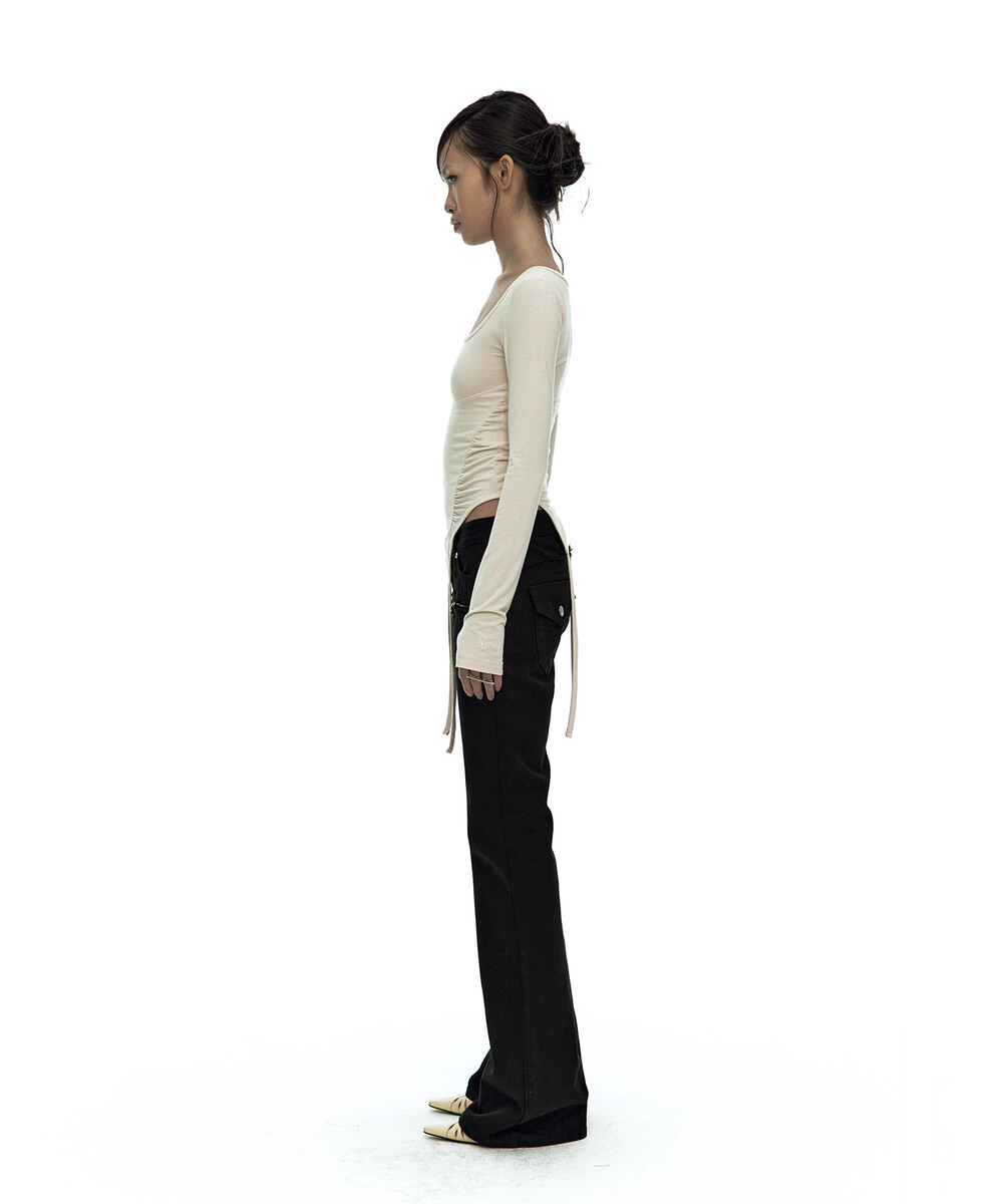 - 허리 셔링과 짧은 옆선 기장으로 슬림한 바디라인 연출