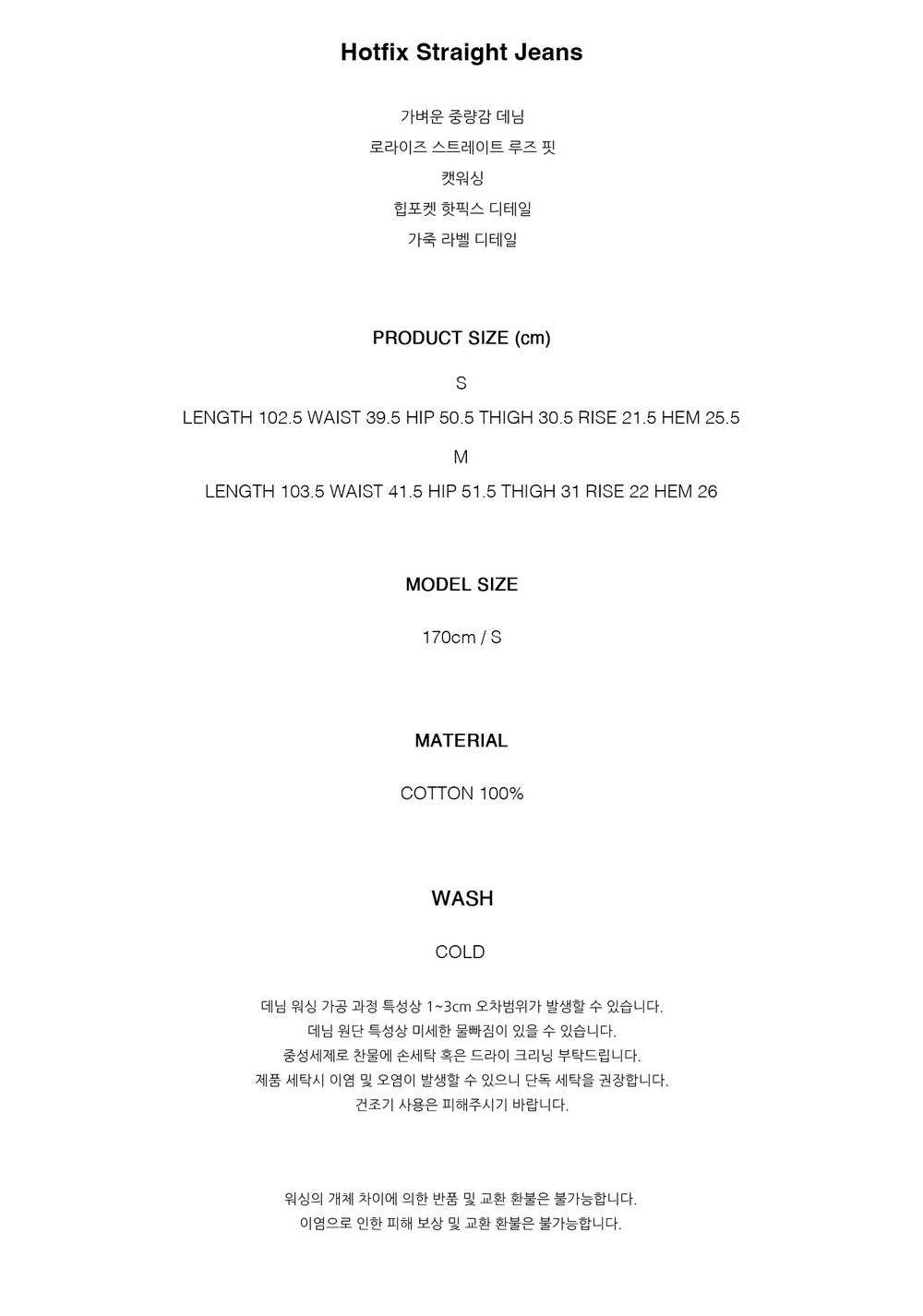 - 제품 제작 과정에서 발생할 수 있는 봉제 자국, 초크자국, 프린트의 작은 이염, 미세 잡사 등은 하자의 사유에 해당되지 않습니다.
